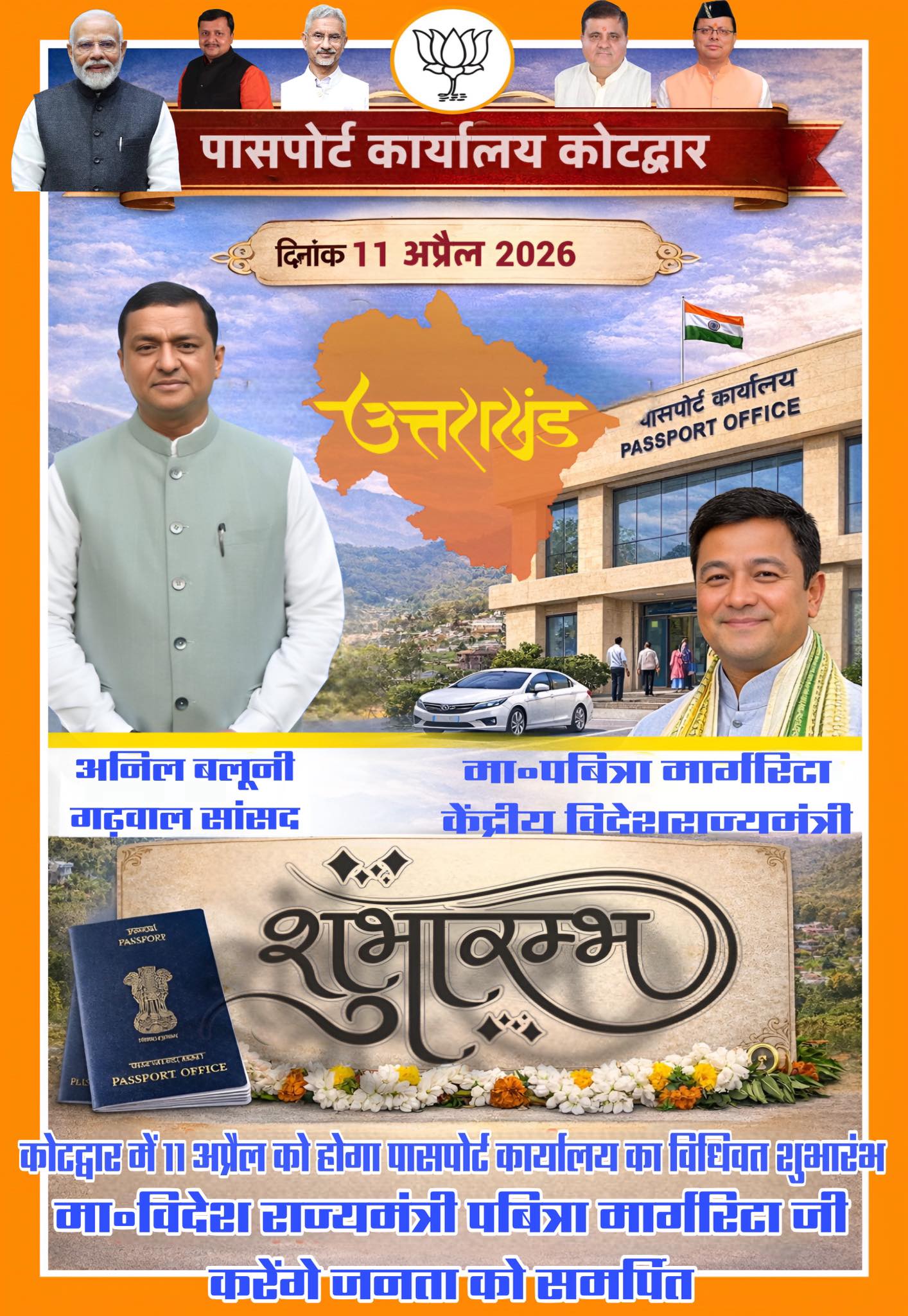 गढ़वाल लोकसभा क्षेत्र के अंतर्गत कोटद्वार में लोगों को एक बड़ी सुविधा मिलने जा रही है। यहां 11 अप्रैल 2026 को नया पासपोर्ट सेवा केंद्र (Passport Seva Kendra) विधिवत रूप से शुरू किया जाएगा। इस केंद्र के शुरू होने से कोटद्वार और आसपास के क्षेत्रों के लोगों को अब पासपोर्ट बनवाने के लिए देहरादून जाने की आवश्यकता नहीं पड़ेगी।नबताया जा रहा है कि गढ़वाल सांसद अनिल बलूनी ने इस सुविधा को क्षेत्र में शुरू कराने के लिए पहले केंद्रीय विदेश मंत्री एस जयशंकर से मुलाकात की थी। उनकी पहल के बाद कोटद्वार में पासपोर्ट सेवा केंद्र खोलने की मंजूरी मिली और अब इसका निर्माण कार्य भी पूरा कर लिया गया है। 11 अप्रैल को आयोजित होने वाले उद्घाटन कार्यक्रम में गढ़वाल सांसद के साथ-साथ भारत सरकार के केंद्रीय विदेश राज्य मंत्री पबित्रा मार्गेरिटा भी मौजूद रहेंगे। स्थानीय लोगों के लिए यह केंद्र बेहद लाभकारी साबित होगा, क्योंकि अब उन्हें पासपोर्ट से संबंधित कार्यों के लिए दूर-दराज नहीं जाना पड़ेगा। यह पहल क्षेत्र में नागरिक सुविधाओं को मजबूत करने और विकास को गति देने की दिशा में एक महत्वपूर्ण कदम मानी जा रही है।